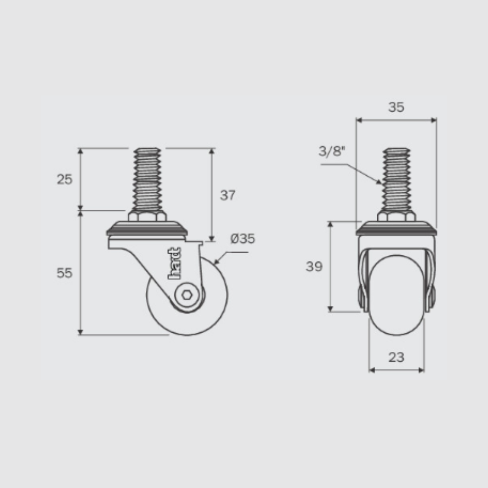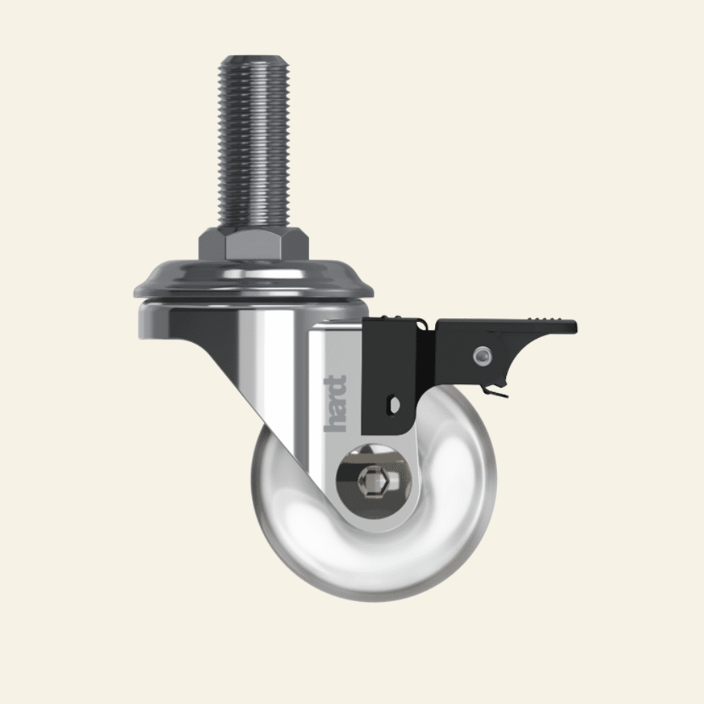 Rodízio com pino roscado, ideal para móveis e equipamentos leves que exigem fixação prática e ajuste de altura. Possui corpo em aço e roda em policarbonato com banda de rodagem em PU, garantindo resistência, durabilidade e deslocamento suave.